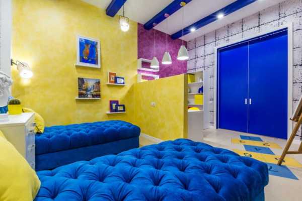 На фото детская комната с декоративной желтой штукатуркой на стене.