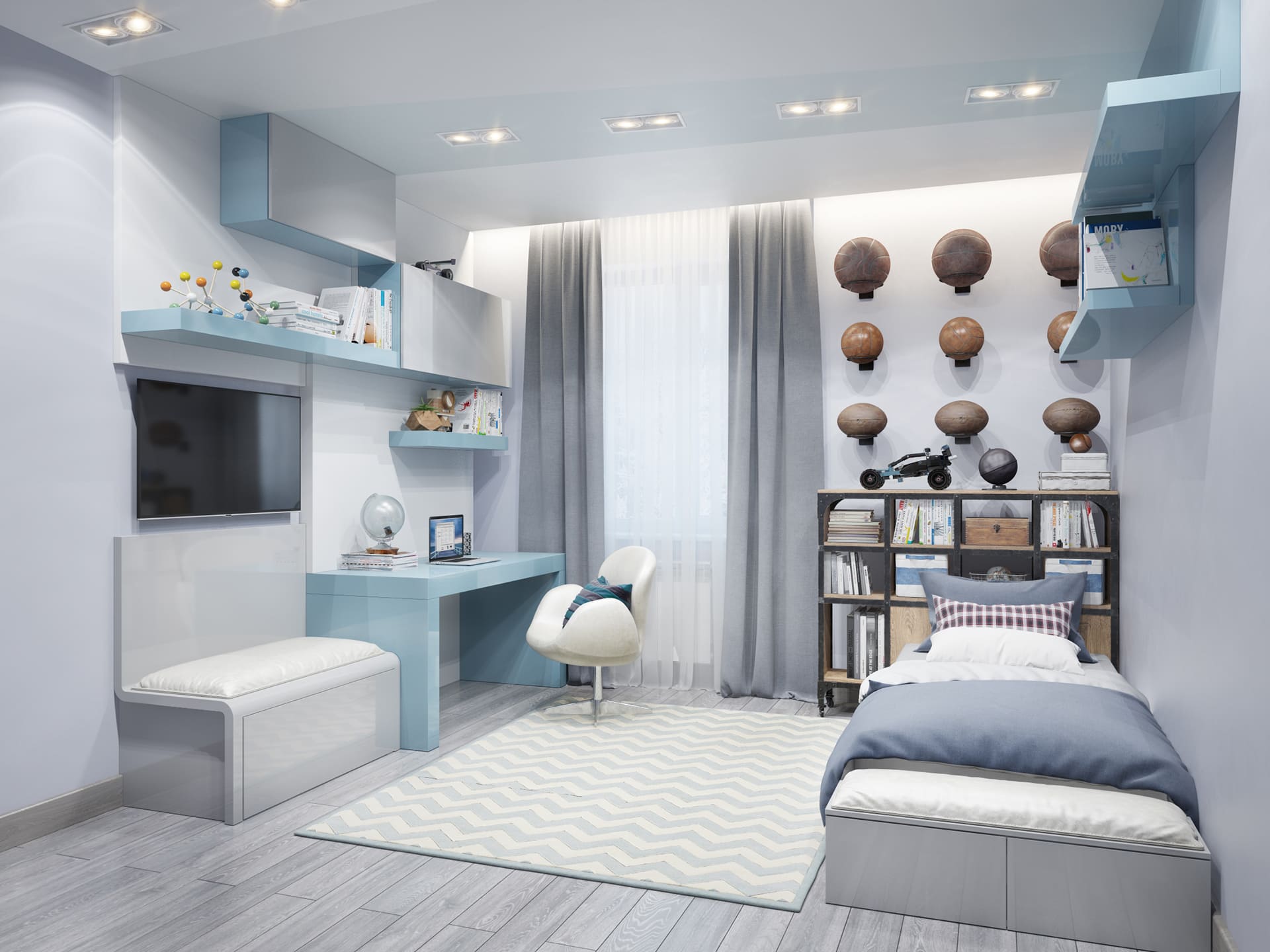 Шкаф для одежды по возможности выбирайте встроенный или угловой, это снизит риск получить травму. Маленькая детская спальня выиграет лишние полметра за счет встроенной мебели.