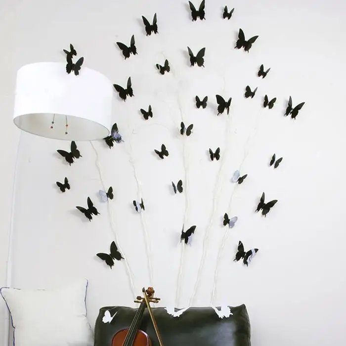 Украсить интерьер гостиной, спальни или любой другой комнаты можно бумажными бабочками, для этого надо приобрести шаблоны, наклейки или изготовить их самостоятельно. Украшения должны быть выполнены из высококачественного цветного картона.