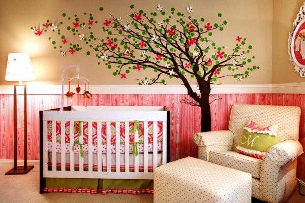 - если малышке годик, то родители сами придумывают различные декоративные элементы на обои. Это разнообразные рисунки, фотографии зверей, природы, растений.