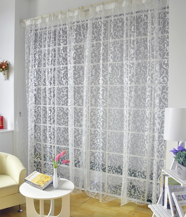 Смесь полиэстера, вуаль. Вариант похож на предыдущий, но тюль-вуаль прекрасно пропускает воздух, не требуя при этом какого-то особого ухода. Часто в качестве декоративных элементов добавляются нити хлопка или шерсти и если вам хочется избавиться от слишком ярких солнечных лучей в комнате, этот вариант прекрасно подойдёт. Объёмные украшения на вуали сделают защитой от света даже полностью белый тюль.